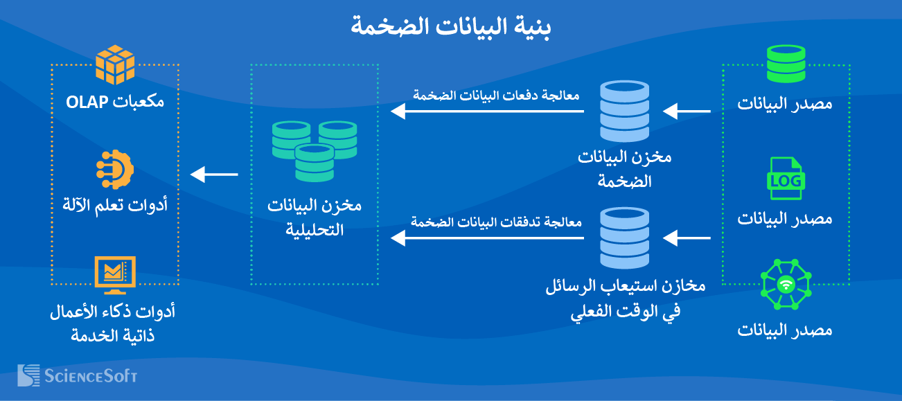 البيانات الضخمة هي بيانات متعددة المصادر، بكميات هائلة، مختلفة في طبيعتها (مهيكلة، وشبه مهيكلة، وغير مهيكلة)، تتطلب نهجًا خاصًا لتخزينها ومعالجتها.