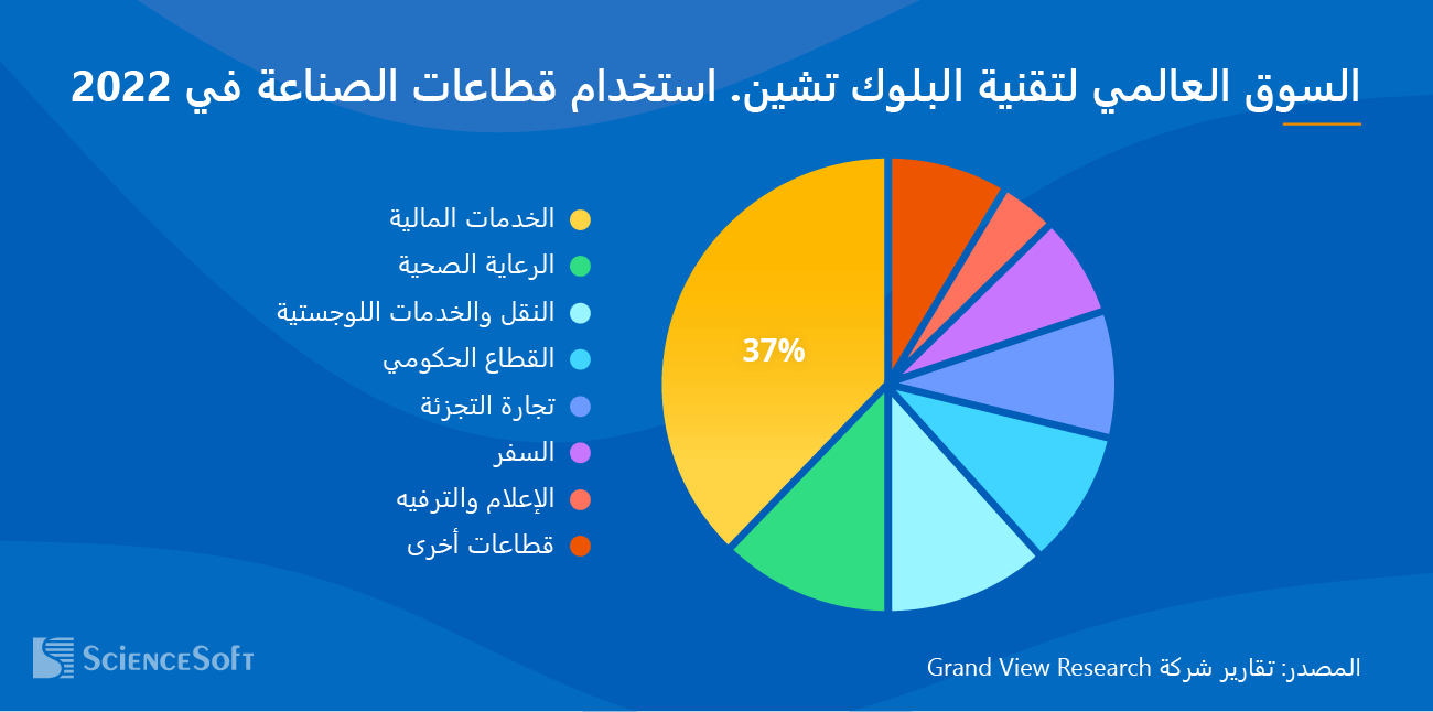 استحوذ قطاع الخدمات المالية على أكثر من 37% من إجمالي إيرادات السوق العالمي لتقنية البلوك تشين في عام 2022، حيث كان لقطاع التأمين النصيب الأكبر بين الصناعات الرائدة في تبني تقنية البلوك تشين.