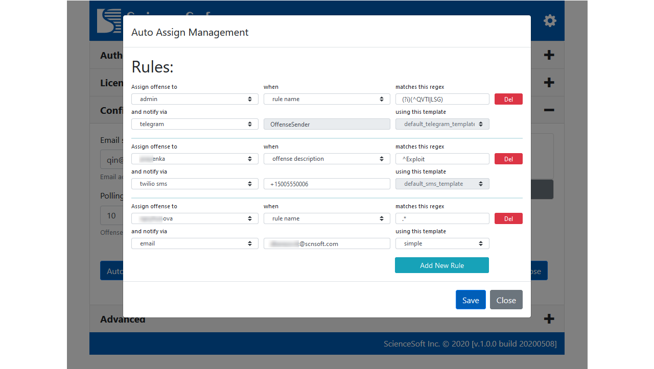 Every rule is based on a regex that can be applied to offense description, name of the rule that has triggered the offense, offense category, or the actual payload of related events and/or flows. Integrated Rule Manager and Template Editor make it so easy to configure the app.