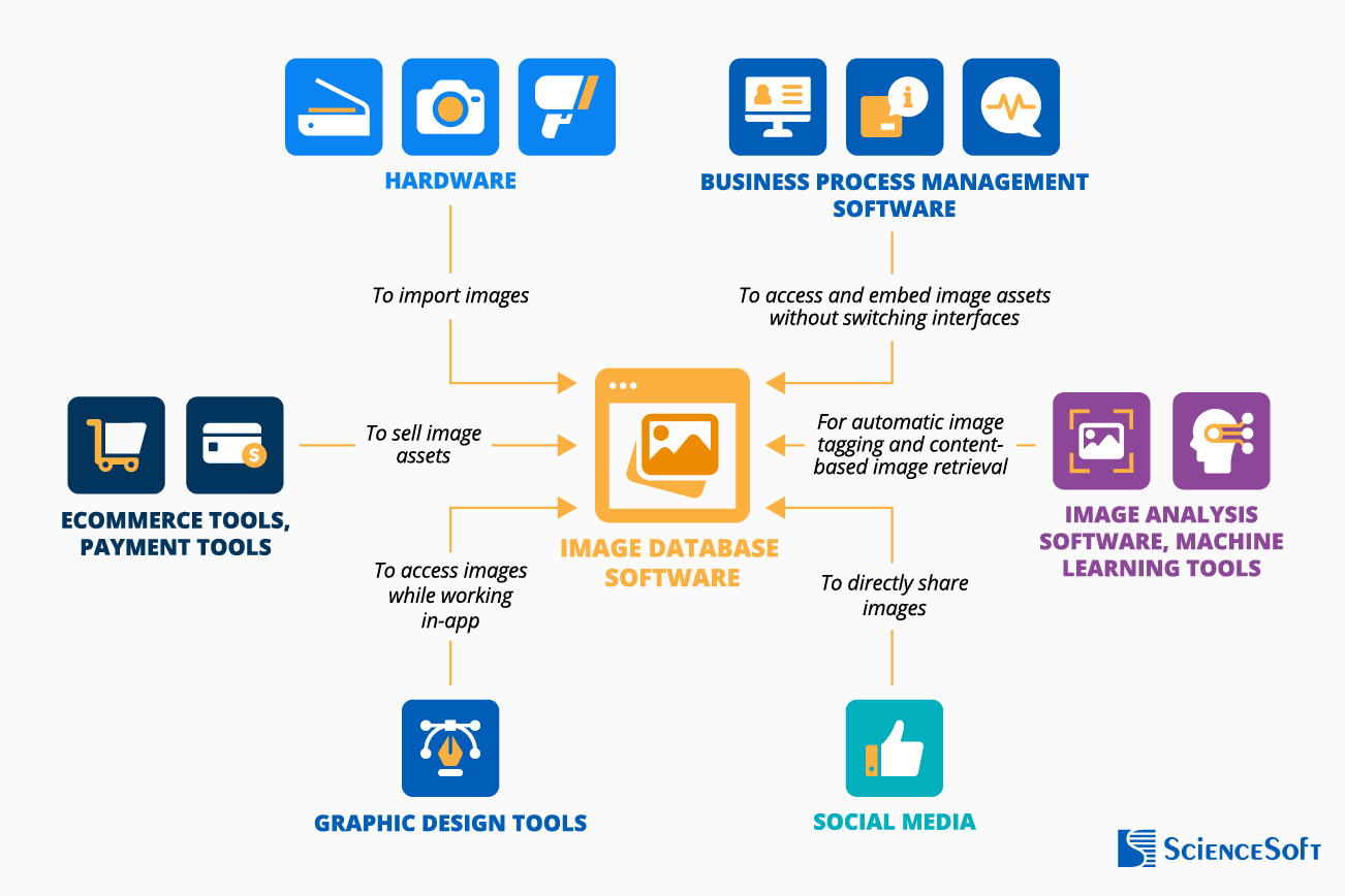 Image database software (also image library software) is a centralized cloud or on-premises repository to upload, store, categorize, retrieve and share digital image assets – photos, scans, layered design files, design elements (logos, icons, etc.), medical imaging, and more. Users interact with the database via a web interface.