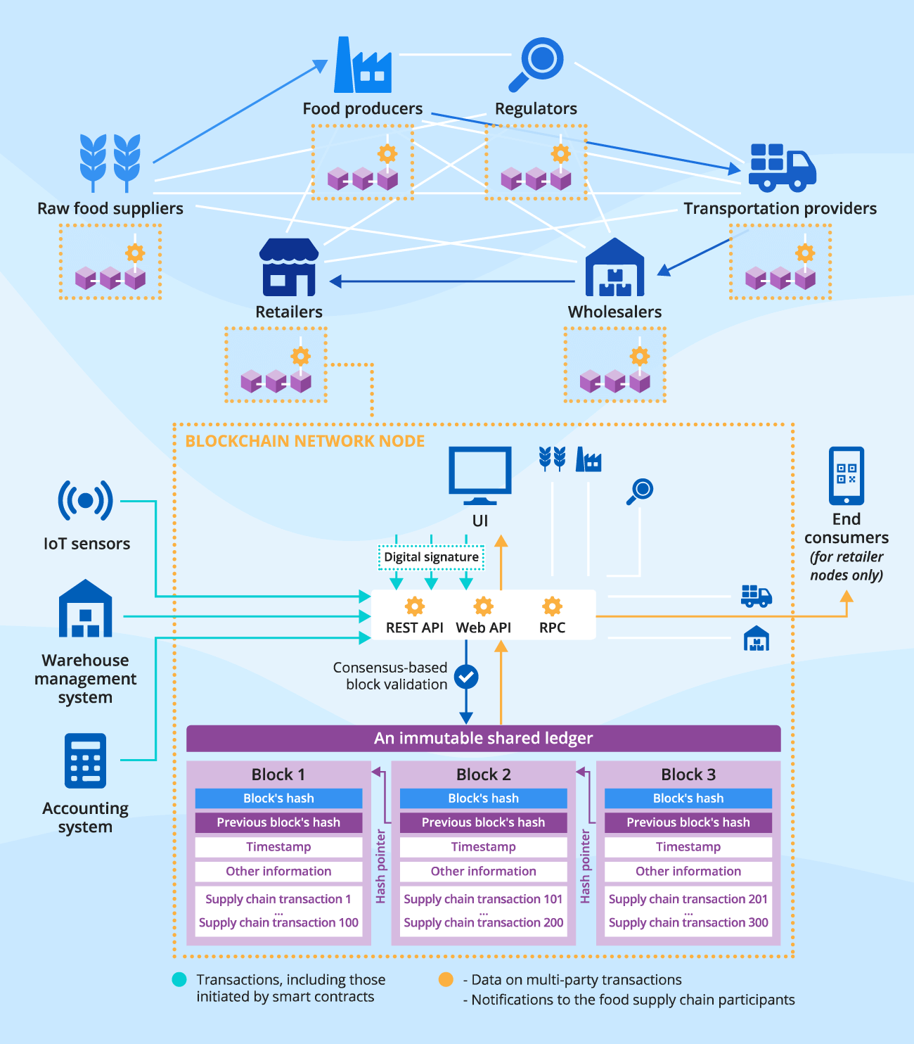 Blockchain for the food supply chain is built around a distributed ledger that contains data on all food supply chain transactions and events. The ledger is formed by timestamped and encrypted data blocks linked in chronological order. Each block holds a batch of transactions validated based on the pre-defined consensus protocol. Food supply chain participants interact with the blockchain ledger using the role-specific web and/or mobile applications.