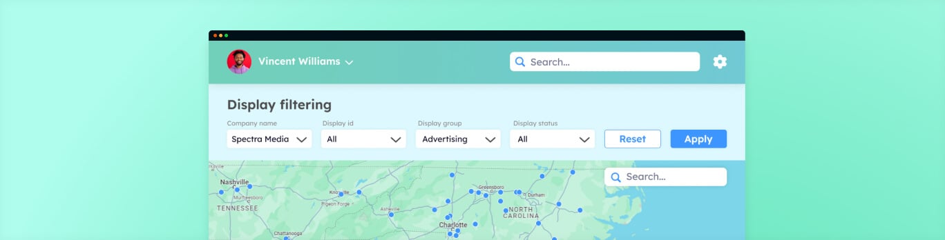 Display management is used by the Client’s and end customers’ admins to manage display lists via adding / removing monitored displays and organizing them in editable groups.