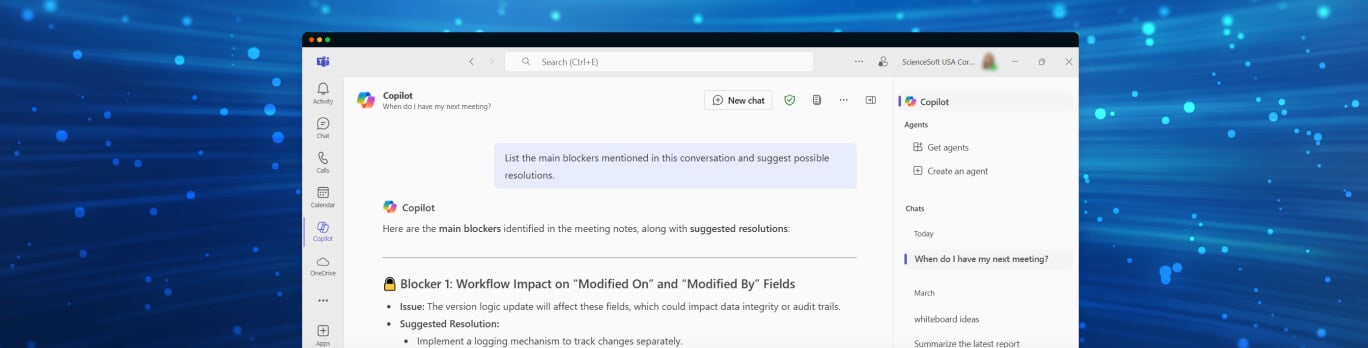 To explore the business value of generative AI, ScienceSoft’s management launched an internal initiative to equip its sales and account management teams with an AI-powered assistant. Instead of relying on an out-of-the-box product, ScienceSoft built a custom Sales Copilot based on Azure OpenAI and integrated with the company’s on-premises SharePoint and Microsoft Teams solutions. Sales Copilot was designed to help prepare faster and more relevant client communications by automatically enriching responses with case studies and summaries of ScienceSoft’s expertise.