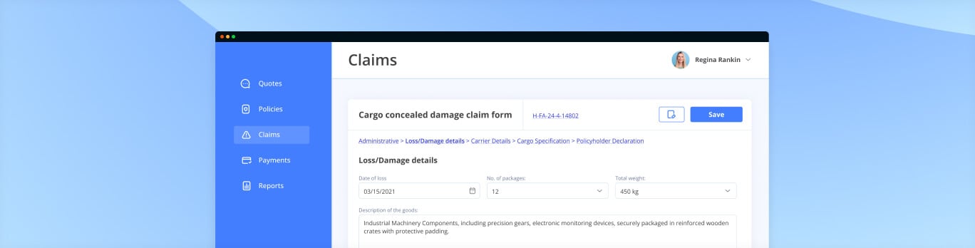 • Automated customer risk scoring based on user-defined parameters: the scope of coverage, cargo type and value, operating location, past claims history, and more.