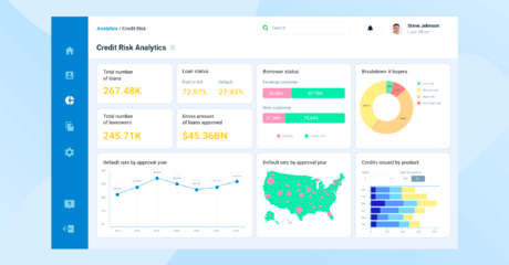 Sample dashboards of credit risk analytics by ScienceSoft. Follow the link to explore what data and KPIs you can control with a comprehensive lending analytics solution.