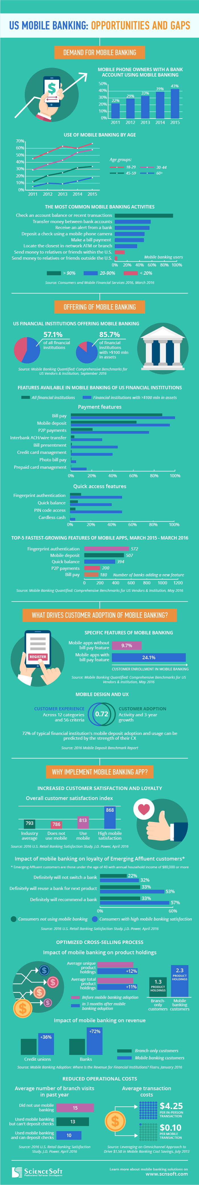 The mobile banking race is now on the rise with more banks, credit unions and other financial institutions that wish to take part in this heated competition. Whether you only consider to introduce this banking software for your clients or already have one, you will definitely call for data reflecting the latest trends in mobile banking development. ScienceSoft has put it all together to help you navigate the mobile banking world. Take a look at this infographic to know more about the following: