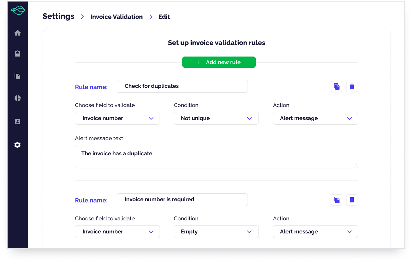 - Rule-based validation of invoice data at the line-item level (invoice number, date, quantity, price, etc.).