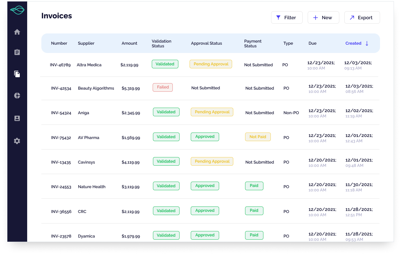 - Real-time multi-department invoice tracking by validation and approval status, type (PO, non-PO), supplier, period, and more.