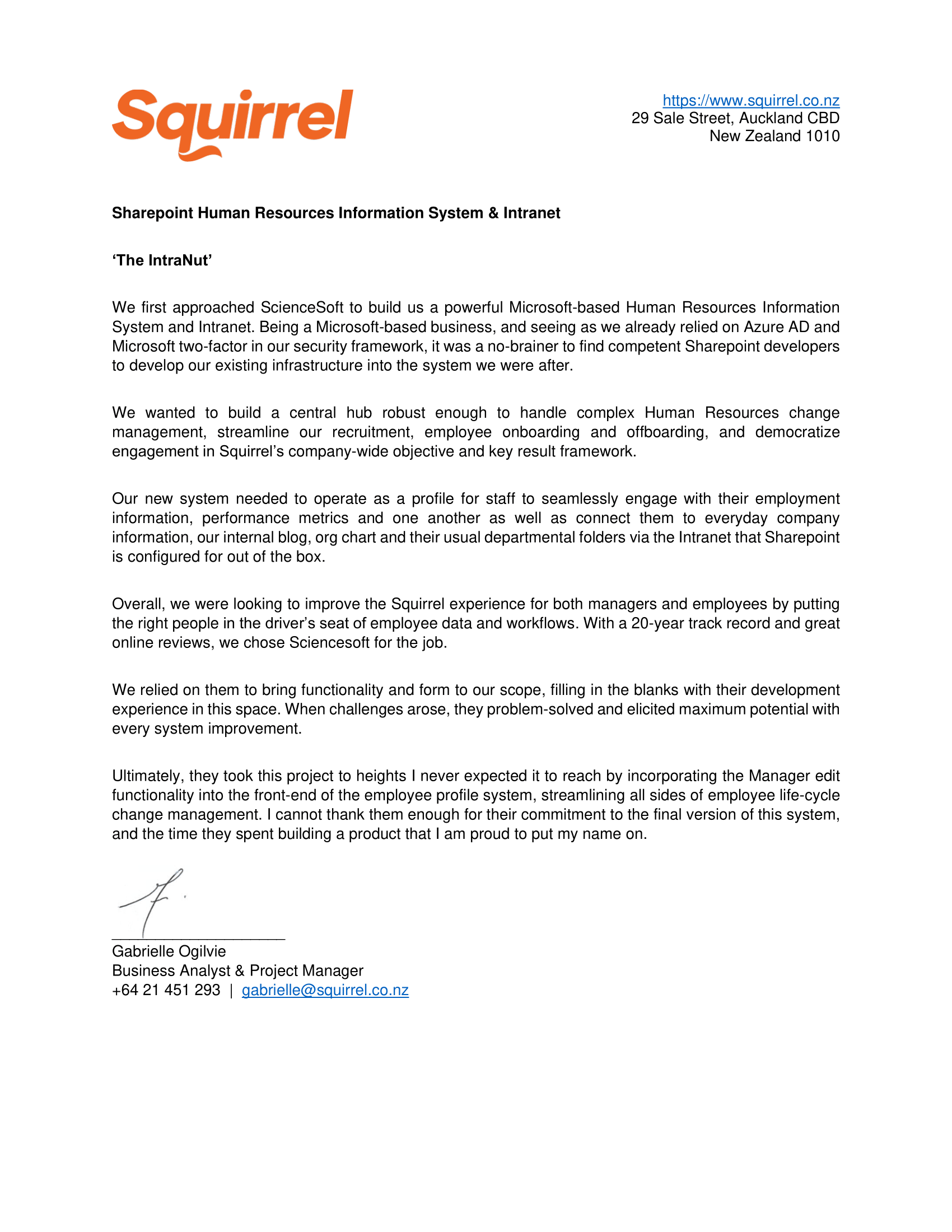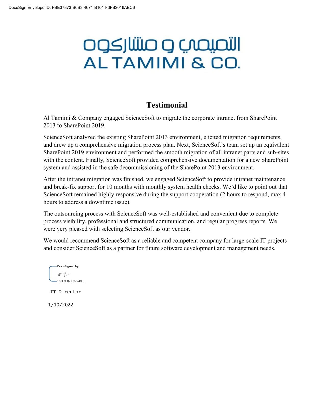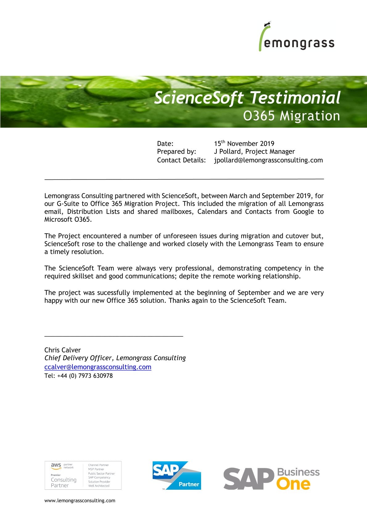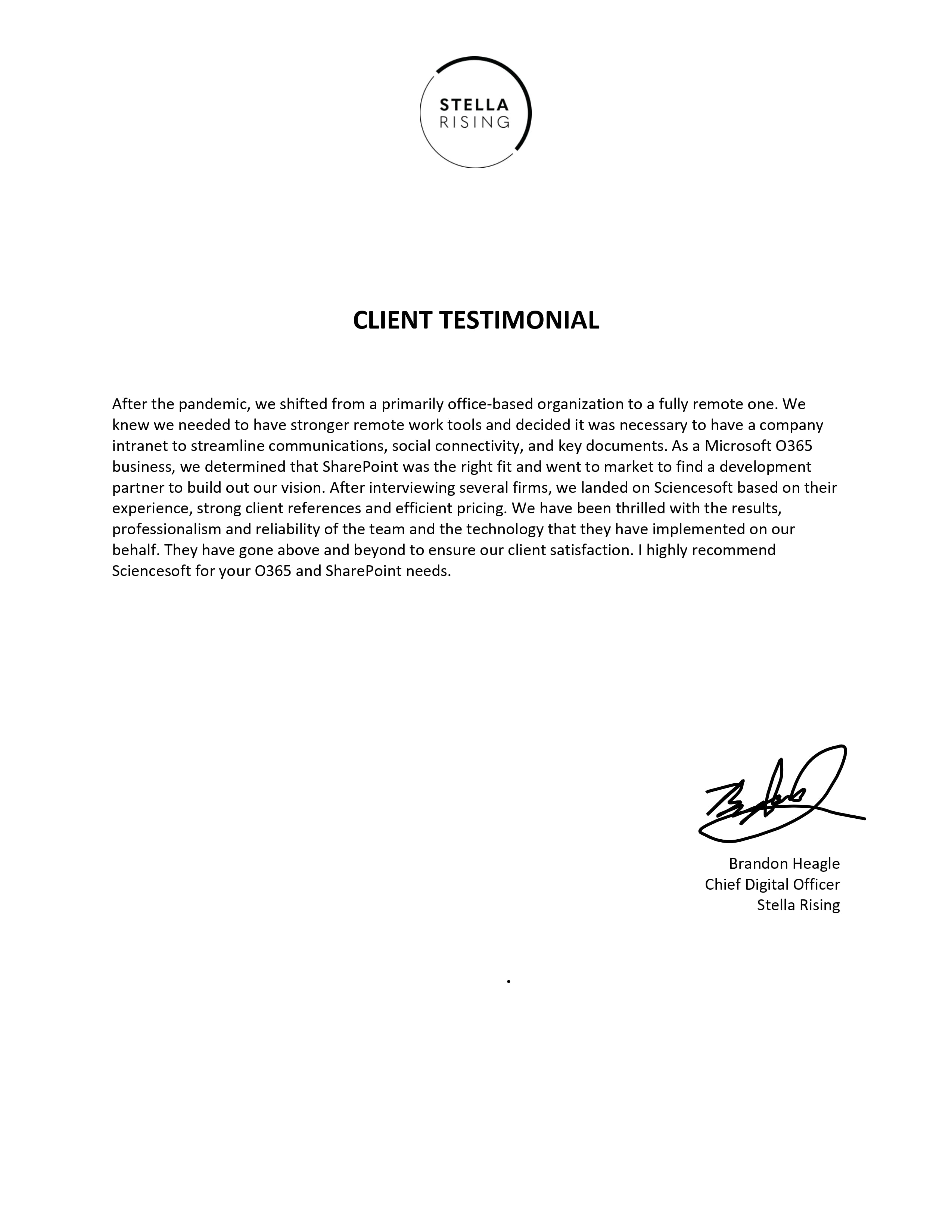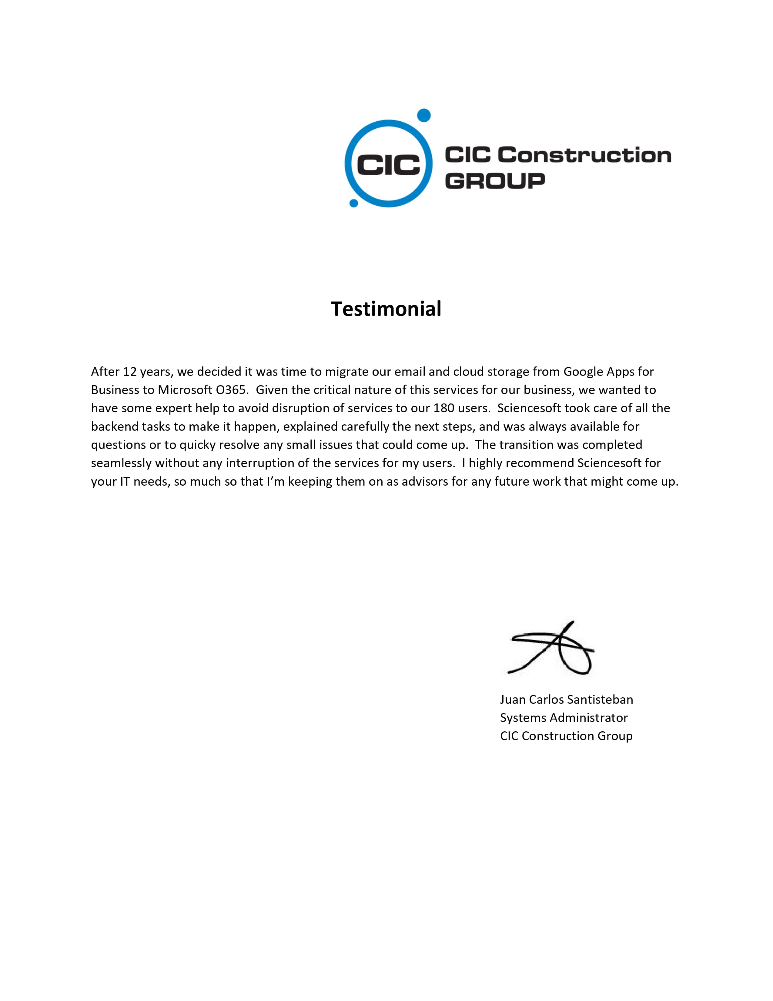 The ScienceSoft Team were always very professional, demonstrating competency in the required skillset and good communications. ... We are very happy with our new Office 365 solution.