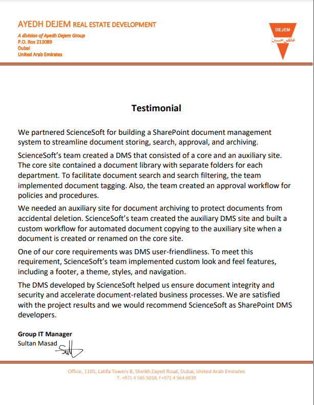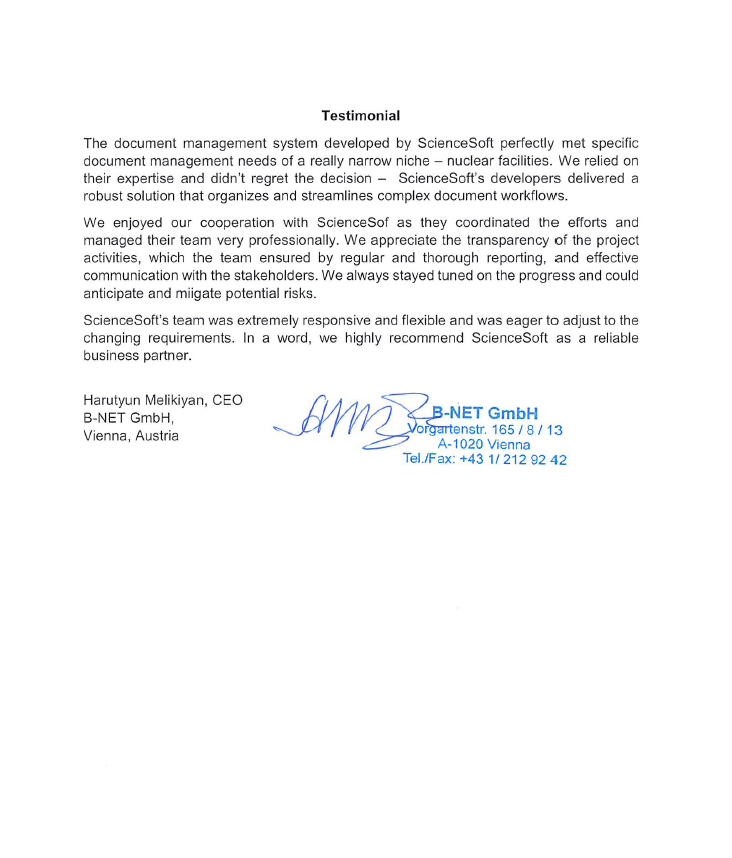 We commissioned ScienceSoft to implement a document management system based on SharePoint Online. They demonstrated good knowledge of the platform and a proactive approach.
