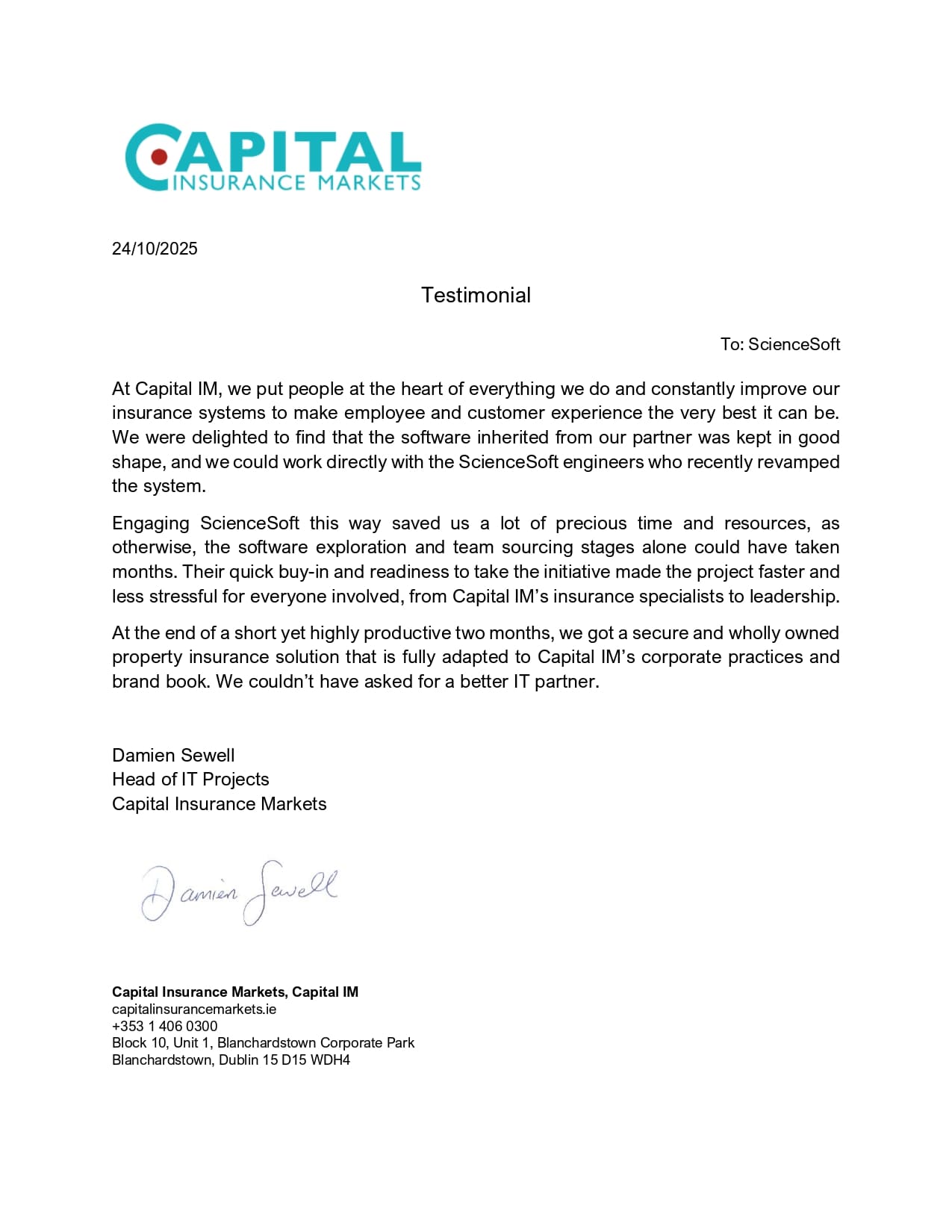 At the end of a short yet highly productive two months, we got a secure and wholly owned property insurance solution that is fully adapted to Capital IM’s corporate practices and brand book. We couldn’t have asked for a better IT partner.