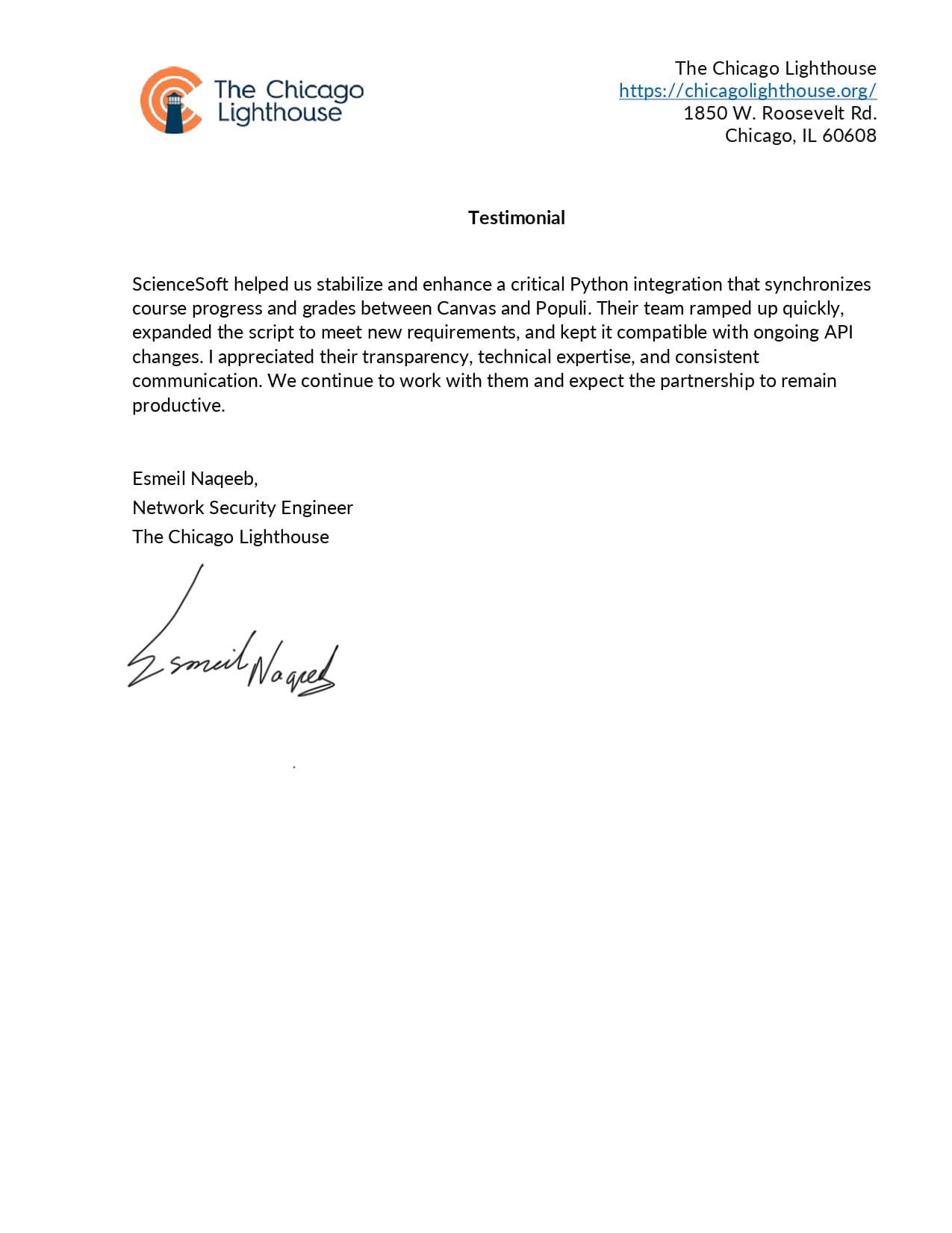 The resulting Proof of Concept exceeded expectations, and we sincerely appreciated the way it was delivered. We found ScienceSoft to be dependable and forward-thinking, and we would confidently recommend them for high-responsibility projects.