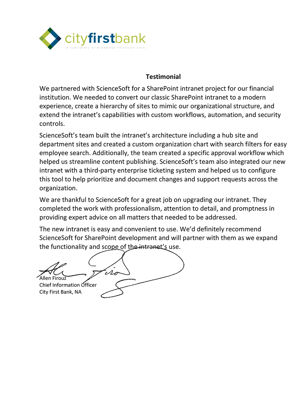 We worked with ScienceSoft in developing our SharePoint Intranet. The development and implementation process was very smooth and delivered the exact results we were expecting.