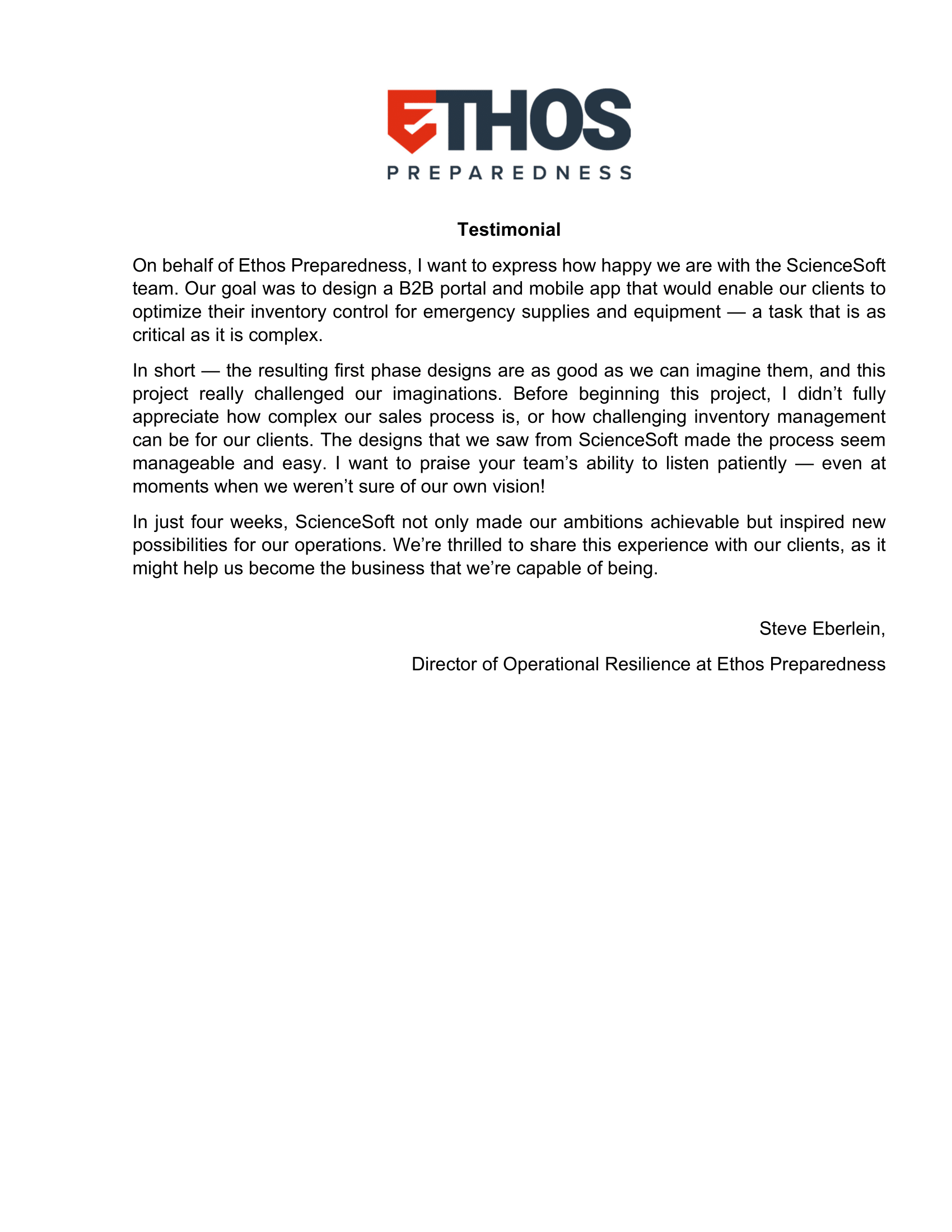 On behalf of Ethos Preparedness, I want to express how happy we are with the ScienceSoft team. Our goal was to design a B2B portal and mobile app that would enable our clients to optimize their inventory control for emergency supplies and equipment — a task that is as critical as it is complex.