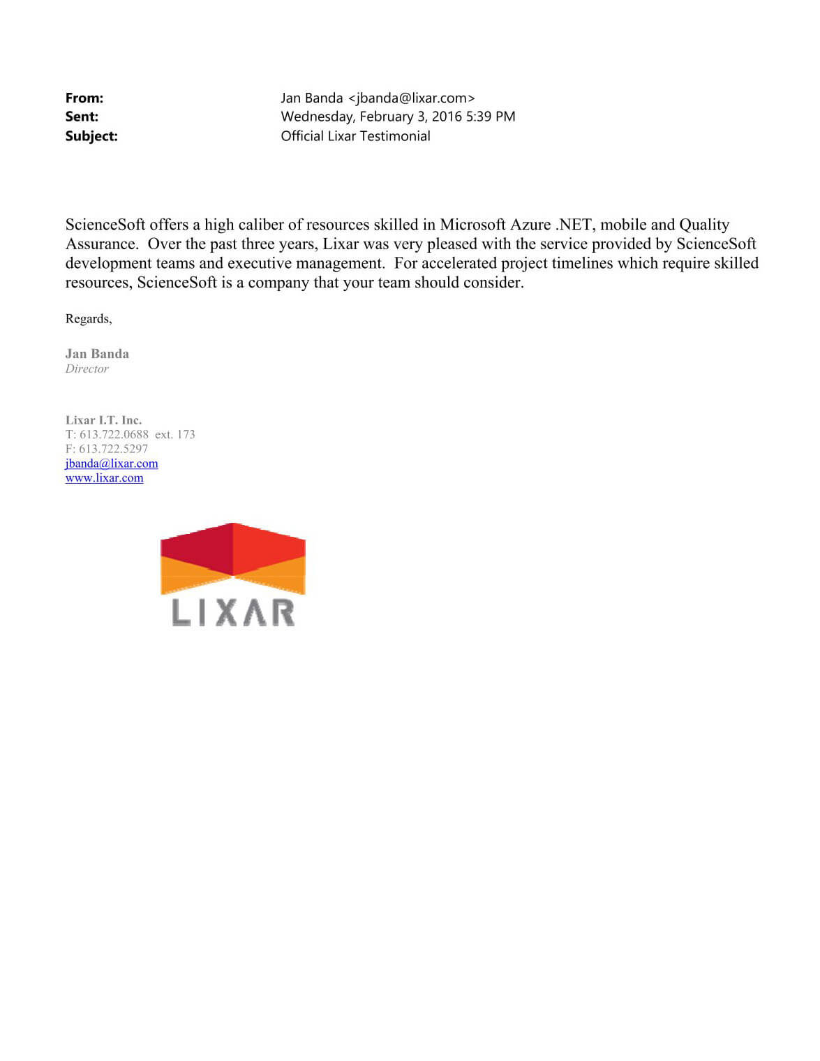 ScienceSoft offers a high caliber of resources skilled in Microsoft Azure .NET, mobile and Quality Assurance. Over the past three years, Lixar was very pleased with the service provided.