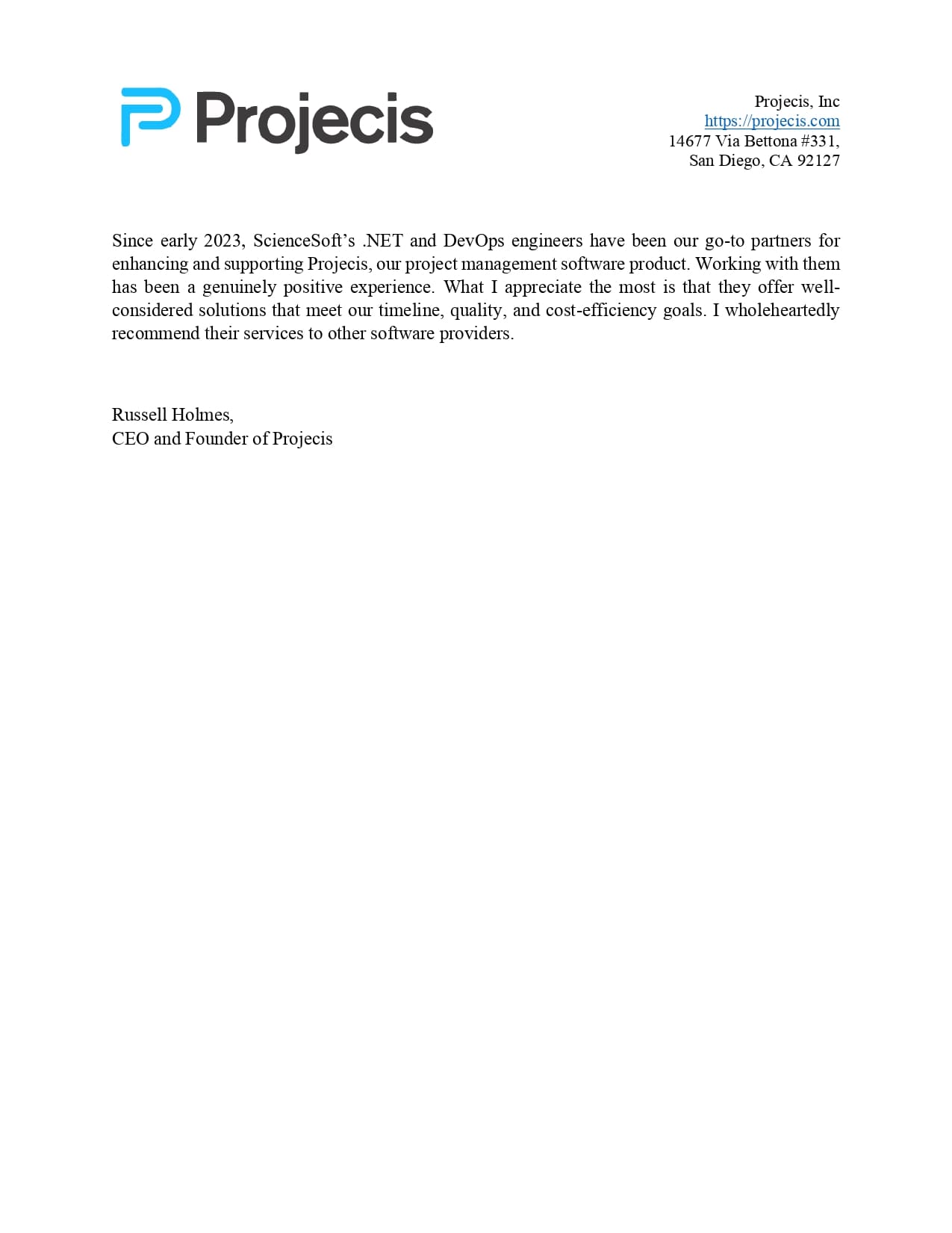 Since early 2023, ScienceSoft’s .NET and DevOps engineers have been our go-to partners for enhancing and supporting Projecis, our project management software product.<...> I wholeheartedly recommend their services to other software providers.