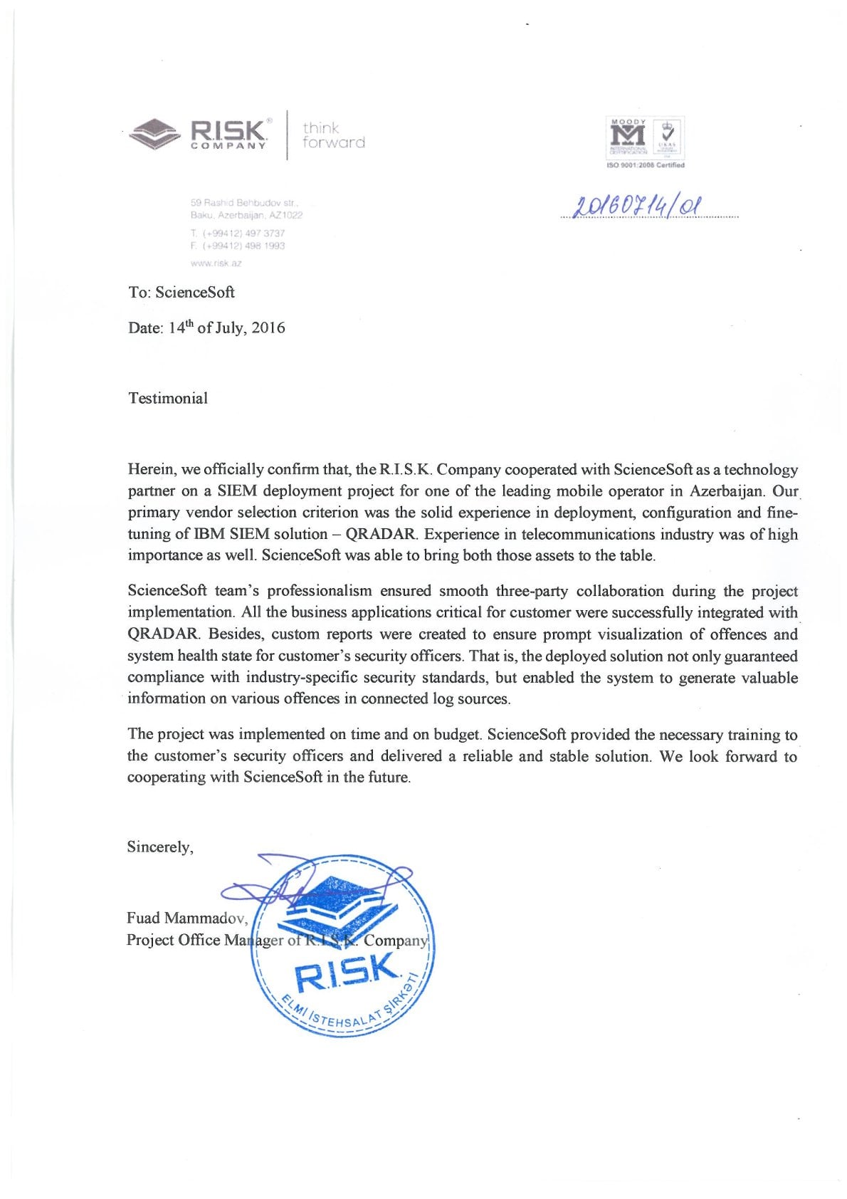 Thanks to their expertise and actionable advice, we are now confident that our data and IT assets are adequately secured against malicious attacks. We are thankful to ScienceSoft for their fast and transparent service.