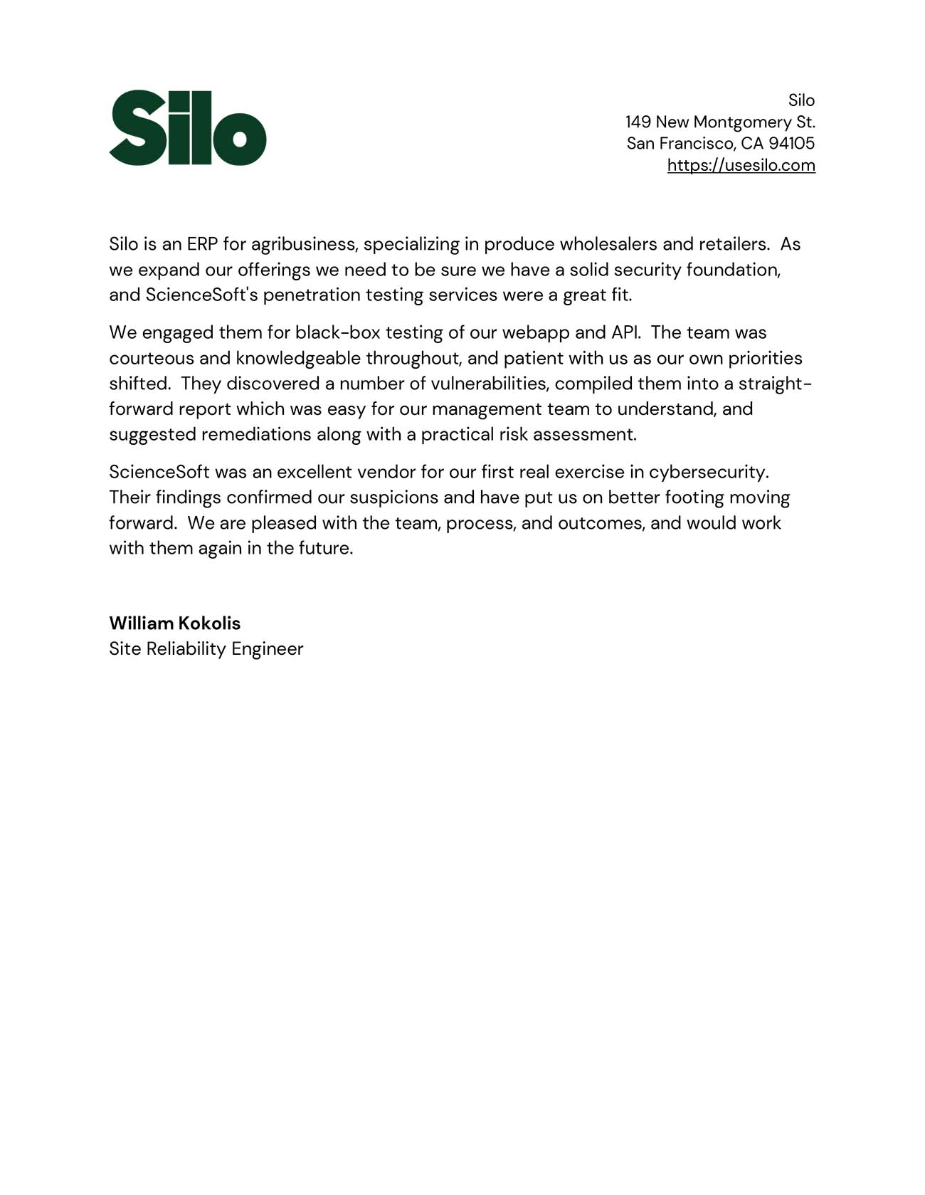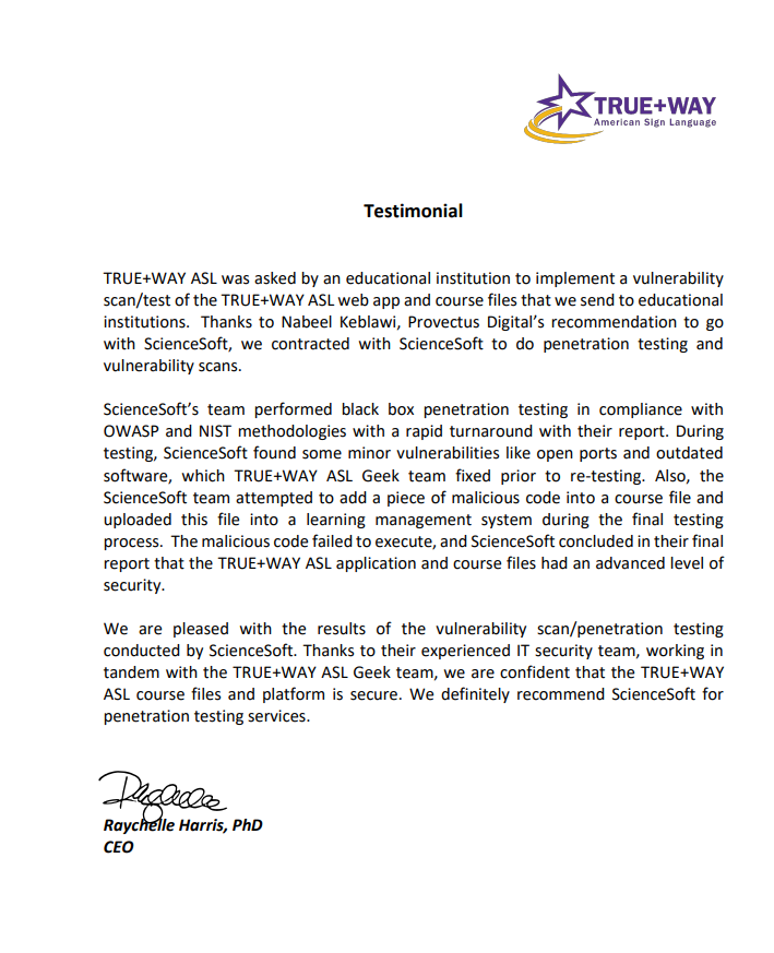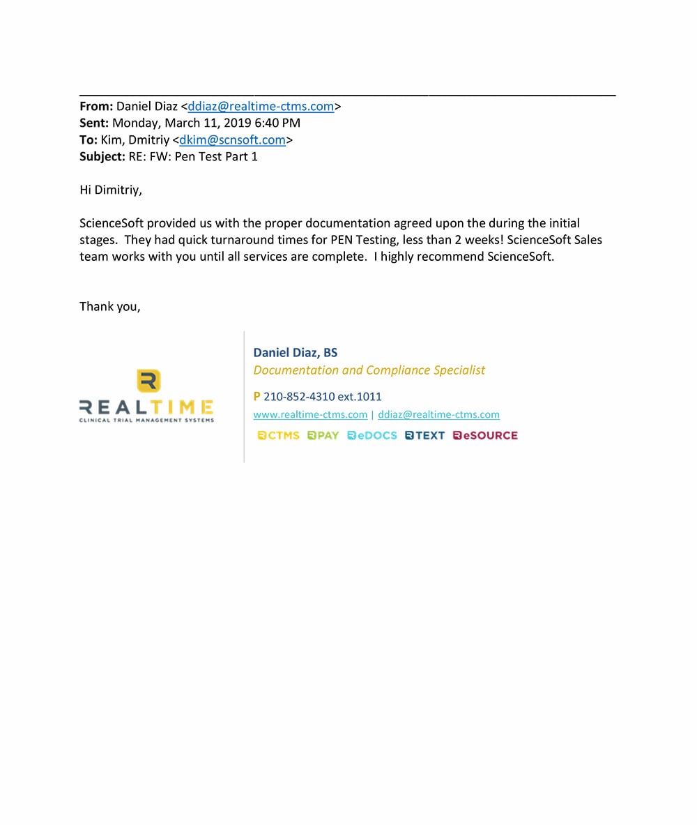 As part of our ongoing security program, we brought in ScienceSoft to conduct thorough black- and gray-box penetration testing on our web and mobile applications. The report gave us clear, actionable insights that helped us strengthen our cybersecurity defenses and ensure compliance.