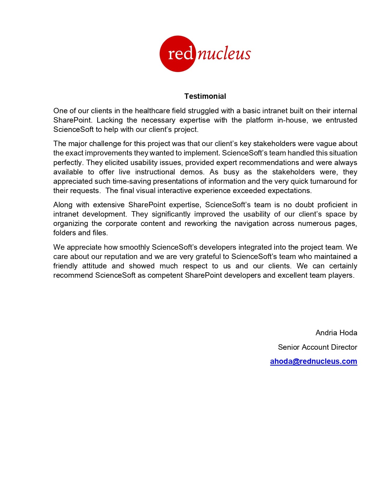 ScienceSoft gave us a team of very talented resources to not only implement our ideas but also help with cleanup and best practice implementation of our SharePoint environment.