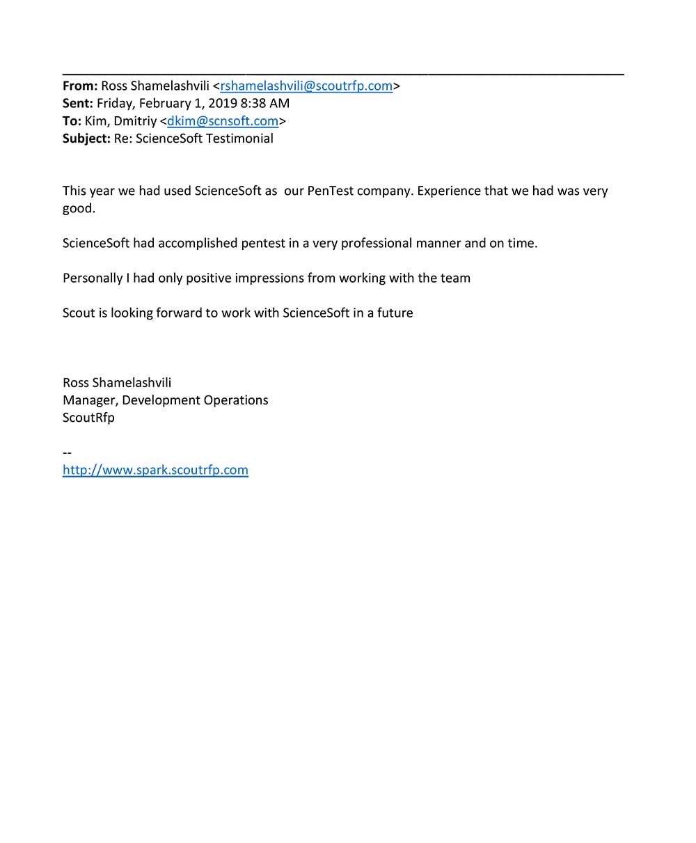 Throughout security testing activities, ScienceSoft’s cybersecurity team proved to be result-oriented and attentive to detail.
