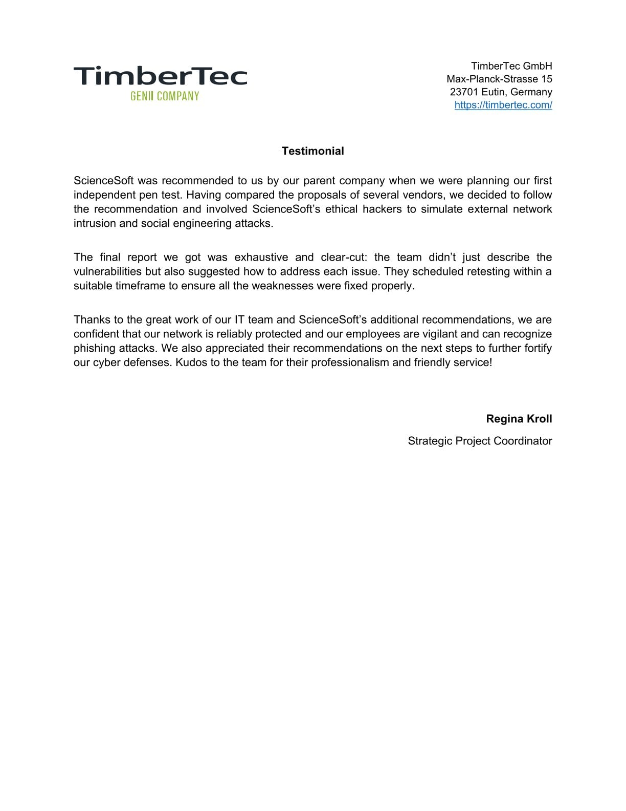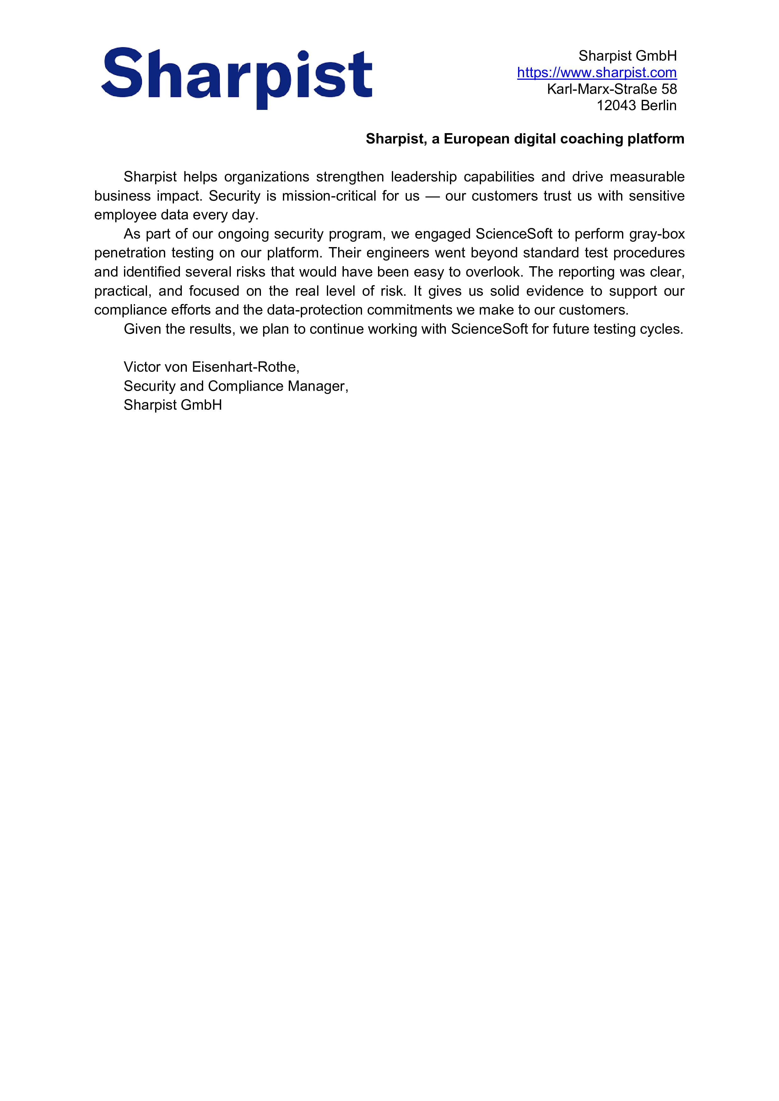 Their engineers went beyond standard test procedures and identified several risks that would have been easy to overlook. The reporting was clear, practical, and focused on the real level of risk. It gives us solid evidence to support our compliance efforts and the data-protection commitments we make to our customers.