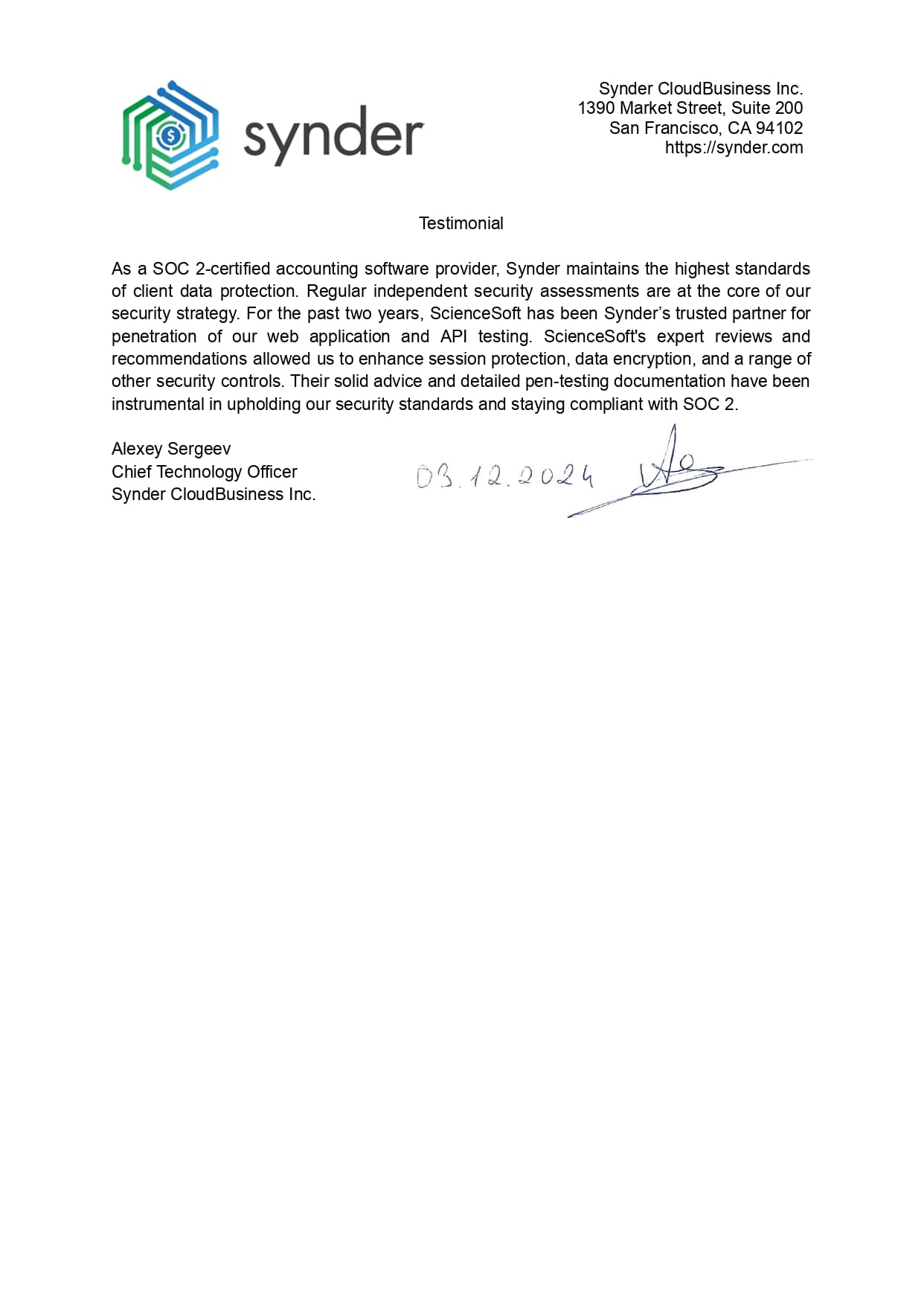 For the past two years, ScienceSoft has been Synder’s trusted partner for penetration of our web application and API testing.