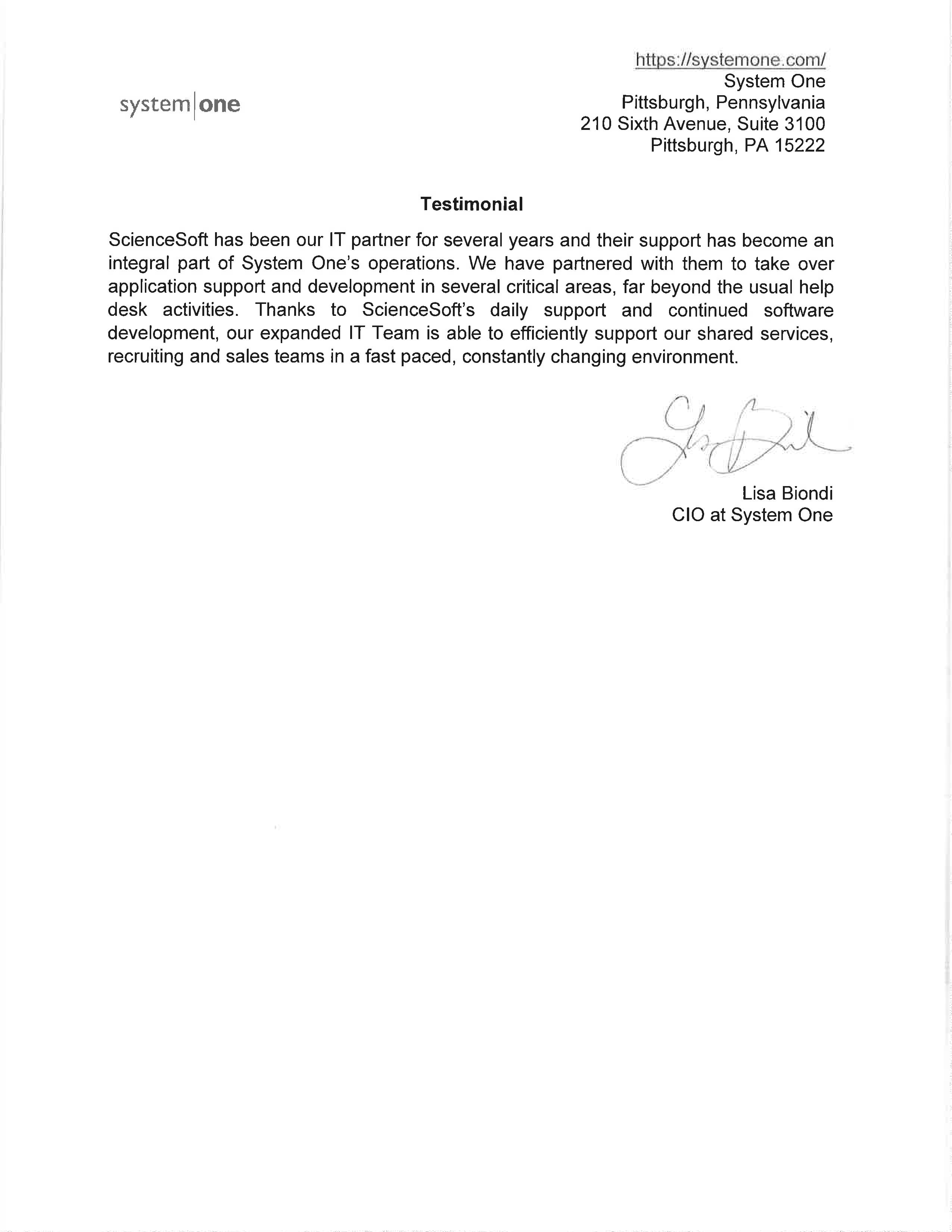 ScienceSoft has been our IT partner for several years and their support has become an integral part of System One’s operations.