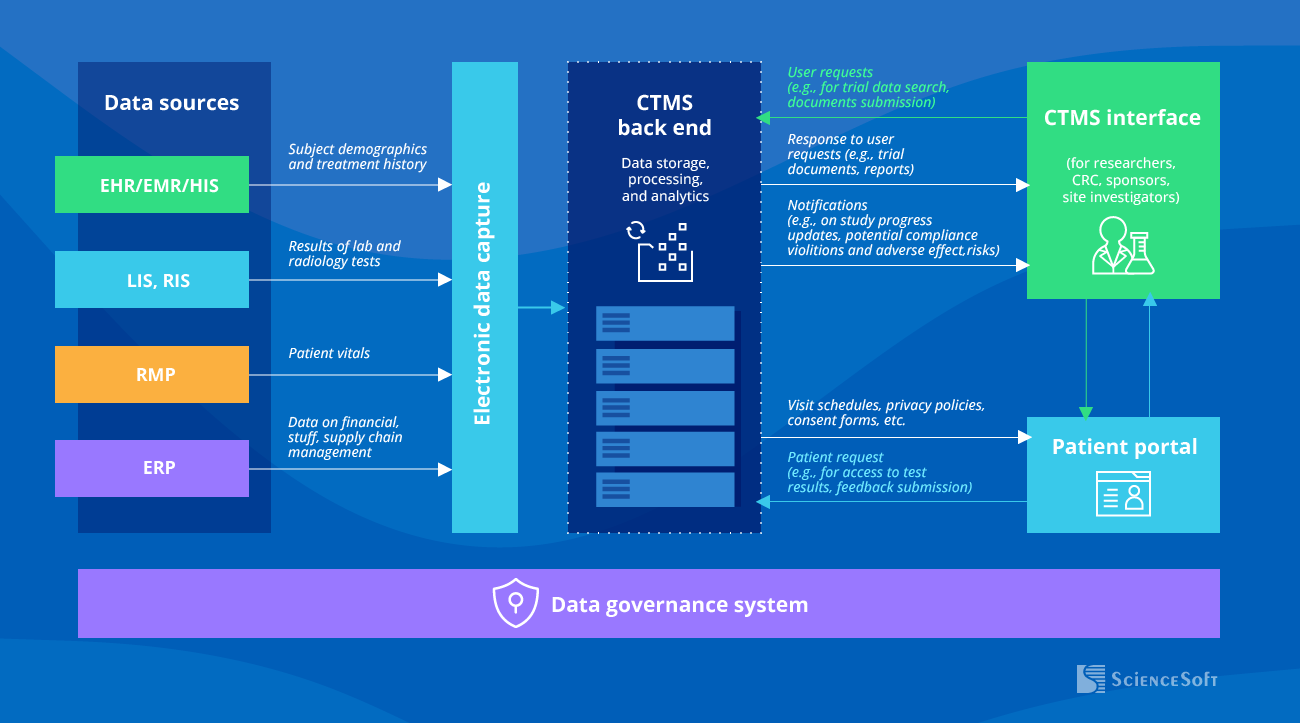 - Common integrations for a CTMS: EHR/EMR, HIS, RIS, LIS, ERP, a payment system, a barcode system, a remote patient monitoring system.