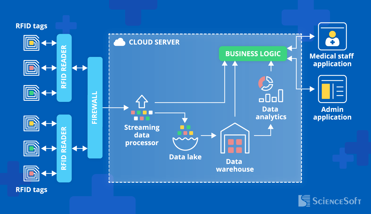 - RFID readers get the asset location information from RFID tags and send it on to the cloud server via the firewall. ScienceSoft recommends locating the readers in hospital corridors, rooms, etc.