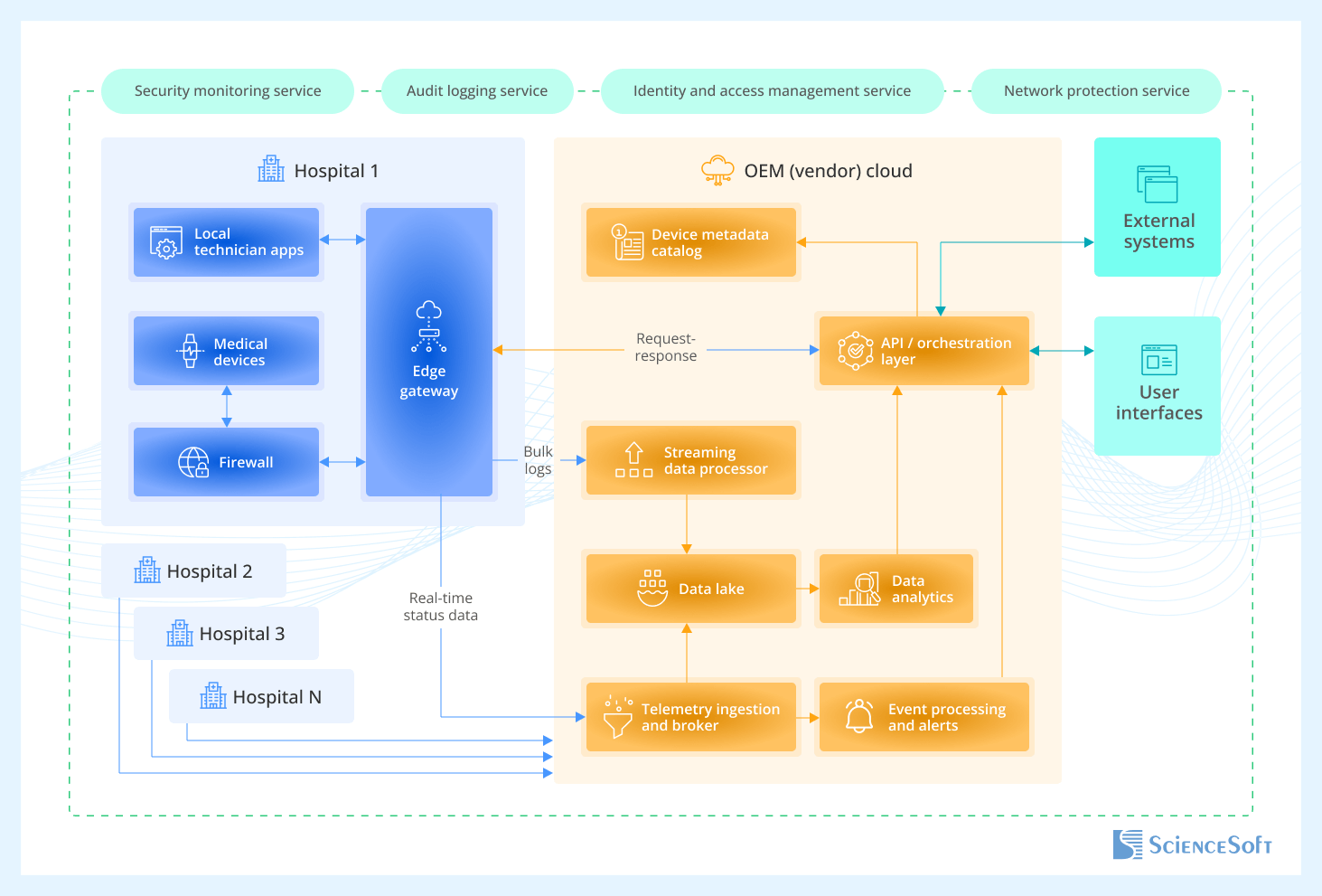 Below is a reference architecture developed by ScienceSoft for an OEM that wanted to ship a connected device management platform alongside its hospital equipment products. The architecture reflects the common needs and expectations of hospital systems and device manufacturers but can be adapted to fit specific product visions, hospital IT environments, and regulatory constraints.