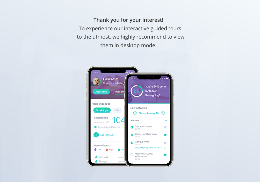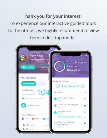 A high-quality patient application offers a wide range of capabilities for patients to monitor and manage their treatment process. The demo below illustrates the app functionality for diabetic patients.