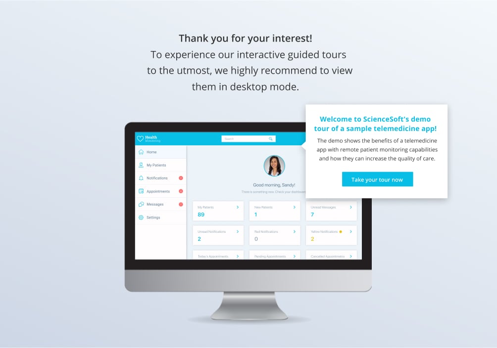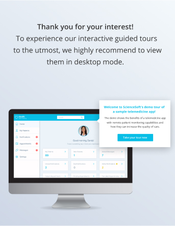 Following up the appointment, the physician creates a treatment plan (from scratch or using a template) noting down the patient’s symptoms, diagnosis, recovery recommendations, and a medication intake plan. The physician can also set up a personalized patient questionnaire aimed at symptoms tracking. The doctor receives notifications on patient health state changes registered by the connected devices (e.g., body temperature back to normal, high blood pressure) and can track the patient’s recovery progress.