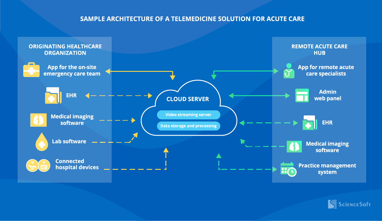 At the core of the telehealth platform for acute care lies a cloud server with a data storage and processing module and a video streaming server. The former stores and enables analysis of patient health data, the data generated by smart medical devices, video call recordings, etc. The latter allows on-site emergency care teams and remote acute care specialists to communicate using video, audio, and instant messaging.