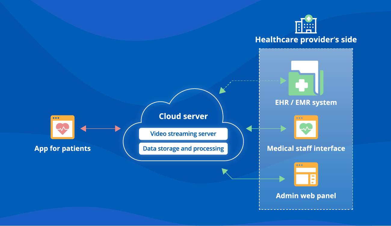 Generally, ScienceSoft delivers EHR-integrated telehealth solutions containing the following architectural elements: