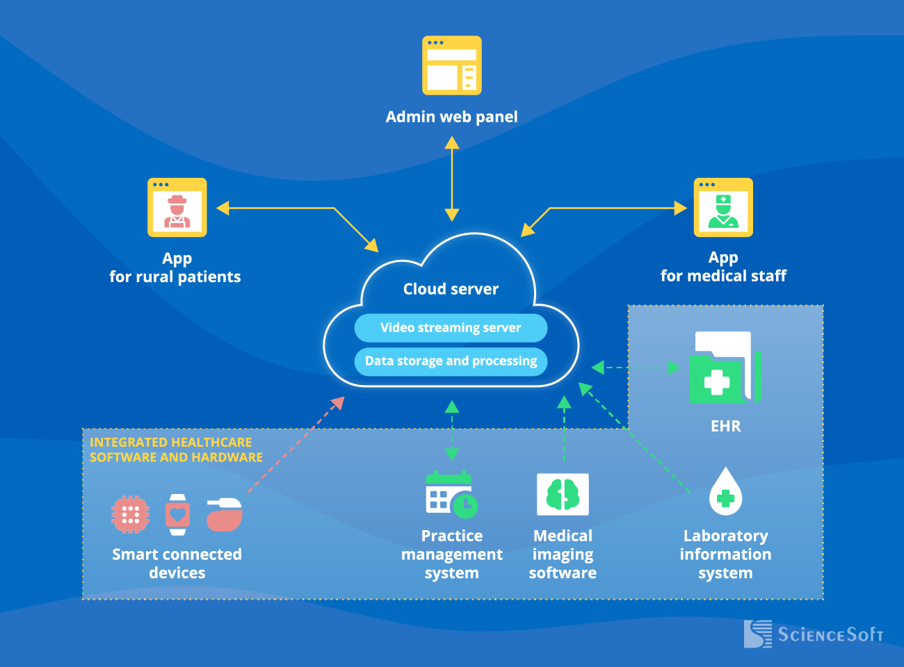 At the core of the telemedicine solution for rural areas is a cloud server with a video streaming server and a data storage and processing module. The former enables real-time audiovisual communication between medical staff and patients. The latter stores patient-doctor video appointments history and recordings, messaging history, shared images (e.g., photos of wounds), PHI (e.g., logged symptoms and vitals), and more.