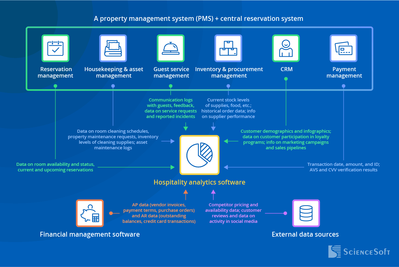 Since most hospitality businesses rely on PMS as the main operational software and data consolidation hub, it makes sense to connect the analytics solution to it for direct data intake. Other operational and back-office software (a CRM, SCM software, channel management software) can be part of the PMS or be connected to it, depending on each business' IT environment.