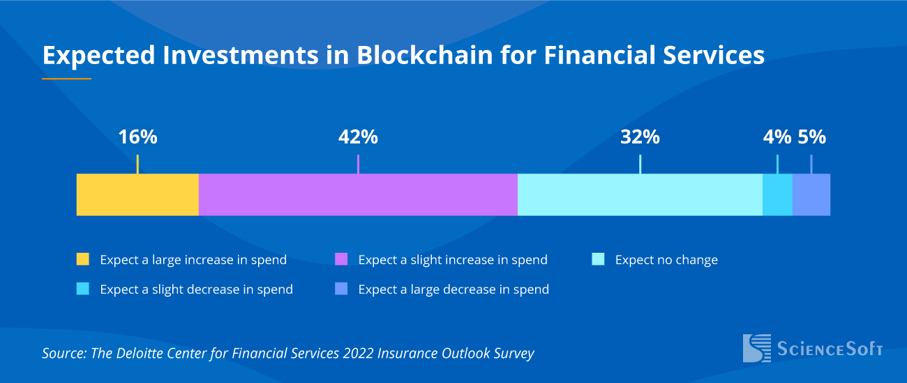 According to Deloitte, 58% of insurance companies are planning to increase their spending on blockchain and distributed ledger technologies (DLT). 65% of insurance executives agree that their organization must adopt DLT to remain competitive, a recent research indicates.
