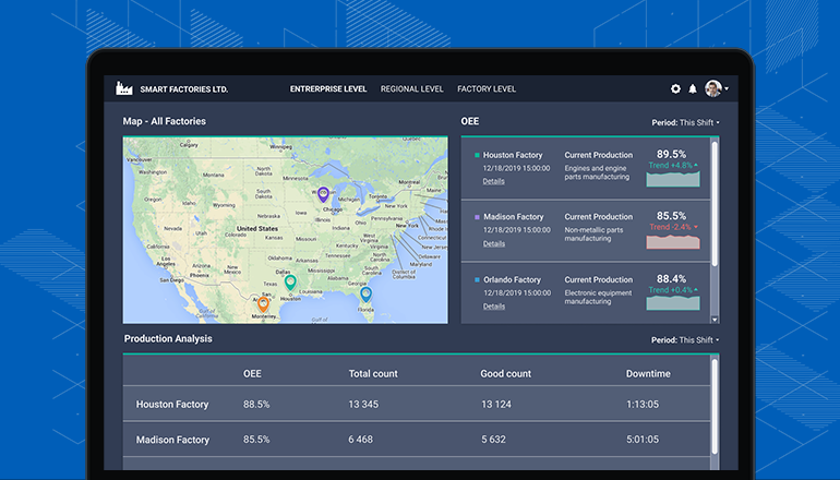The integration of smart factory solution with business and industrial software (e.g., ERP, vendor portal, SCADA, HMI) allows your company to gain control of all operations, from raw materials’ purchasing to quality control and product delivery.