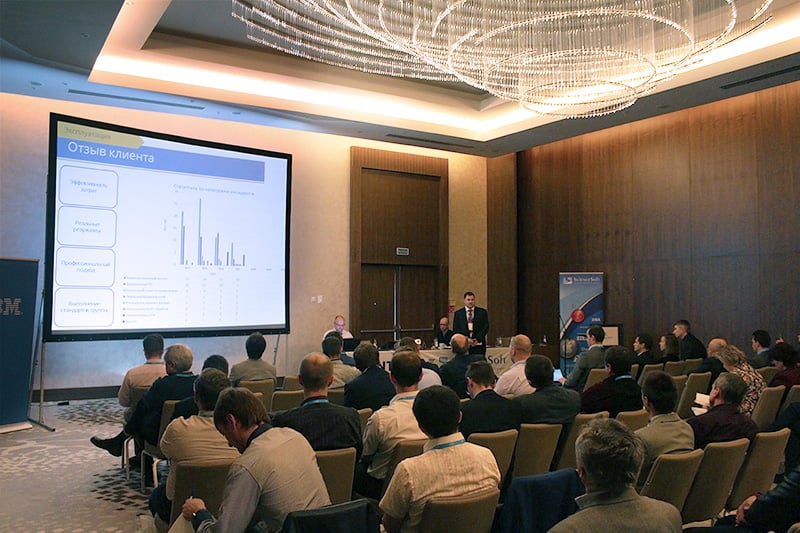 The talk given by the representative of a major bank enjoyed the full attention of the audience as he shared their success story of using a complex solution based on IBM Security QRadar SIEM. The configuration of the product was done by ScienceSoft several months earlier and has already brought about tangible results which were measured and quantified in the presentation.