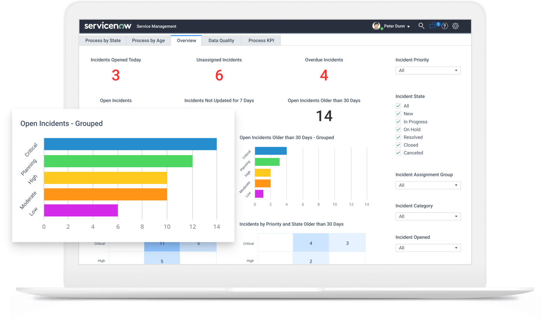 Configurable role‑based reports and dashboards displaying incident statuses (e.g., unassigned, overdue), priority (high, medium low), resolution time, and other metrics.