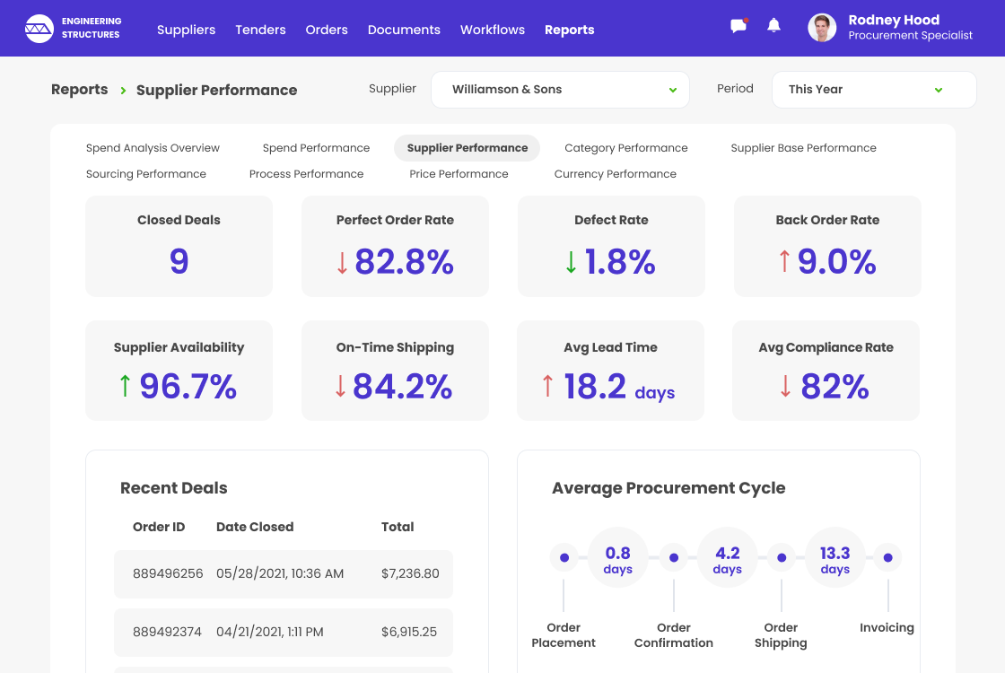 Tracking procurement metrics such as spend under management and cost of purchase order helps to optimize procurement costs. You can also get insights into procurement process optimization (e.g., with process mapping visualization and cycle time tracking). Another purpose of procurement analytics is to assist in choosing optimal suppliers. You can use it to benchmark supplier performance and get smart recommendations on case-specific suppliers.